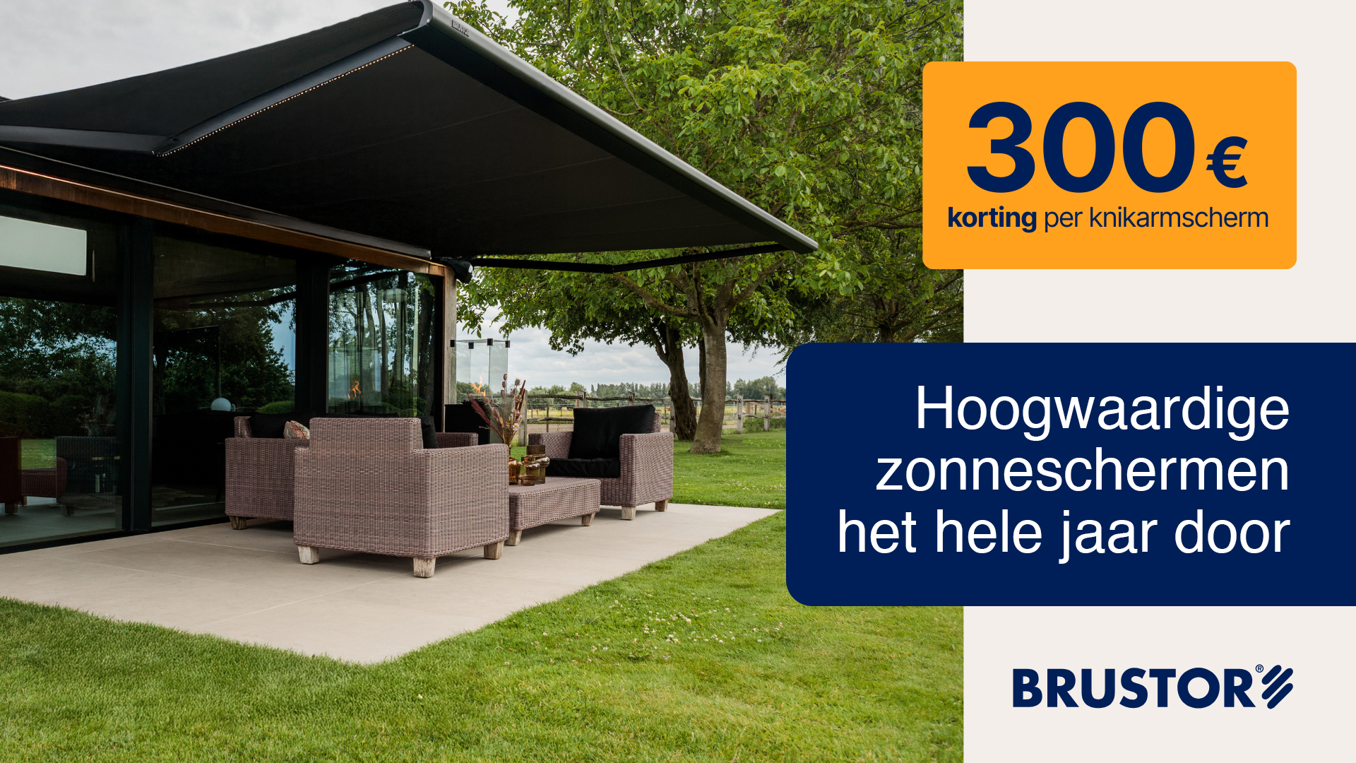 Regel zon en schaduw precies zoals u wilt met een stijlvol Brustor-zonnescherm. Bij Vera Venray profiteert u dit voorjaar van € 300 korting (incl. btw) bij aankoop van een gemotoriseerd zonnescherm. Vraag vrijblijvend een gratis offerte aan.